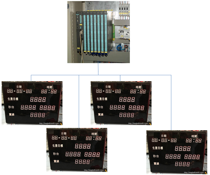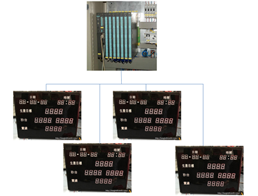 Sử dụng PLC Siemens S7-400 kết nối với led 7 đoạn thông qua mạng Profibus, hiển thị lên bảng led điện tử các thông số về số lượng xe hoàn thành, tỷ lệ bao nhiêu phút, số lượng tổng cần hoàn thành, cùng với giờ phút, ngày tháng năm hiển thị theo thời gian thực