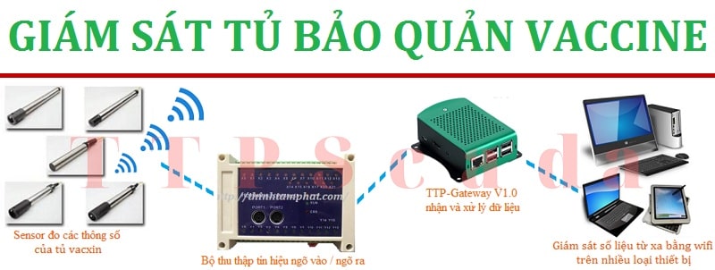 Giải pháp giám sát tủ bảo quản vacxin TTPScada với các cảm biến không dây chất lượng cao, với độ nhạy chuẩn xác, có chức năng đo các thông số khác nhau của tủ đựng vacxin (tủ thuốc, kho dược,...). Các cảm biến được kết nối với TTPGateway, truyền dữ liệu về server (cloud server) và được lưu trữ không giới hạn. Khách hàng có thể theo dõi, giám sát nhiệt độ độ ẩm tủ vacxin từ xa bằng điện thoại (smartphone), máy tính bàn, máy tính xách tay, chỉ cần có wifi hoặc 3G.