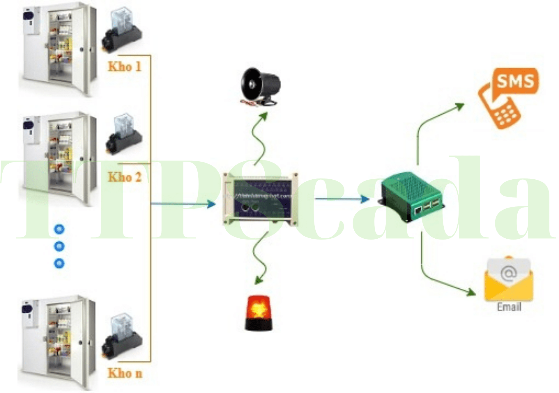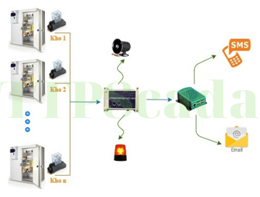 - Hệ thống cảnh báo mất điện cho kho lạnh sẽ thông qua thiết bị I/O của TTPScada để phát ra cảnh báo tại chỗ khi một trong những kho lạnh hoặc tất cả các kho lạnh bị mất điện.
