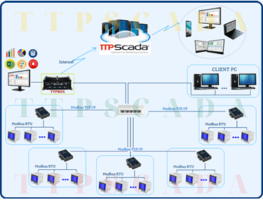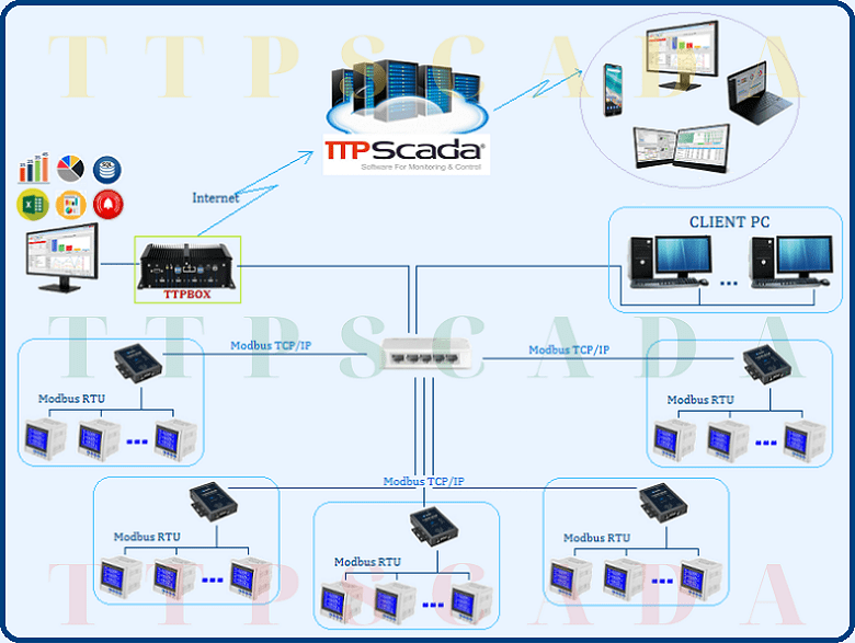 - Hệ thống giám sát điện năng TTPScada có nhiệm vụ thu thập dữ liệu, hiển thị dữ liệu theo thời gian thực, với đầy đủ các số liệu từ tất cả các thiết bị được theo dõi.