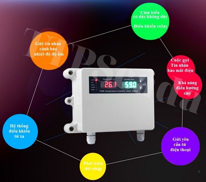 - Gửi thông báo, cảnh báo nhiệt độ độ ẩm hoặc các cảnh báo mất điện,... bằng tin nhắn SMS hoặc gọi điện ngay lập tức