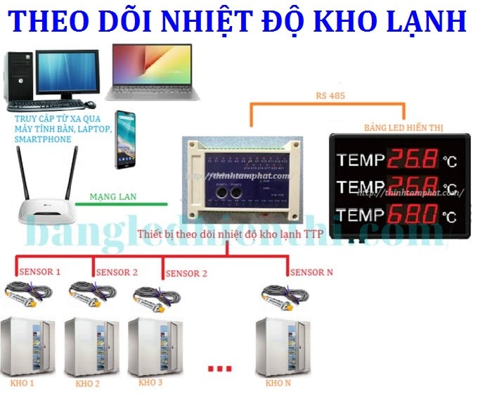 - Với hệ thống này, người dùng không cần mất nhiều thời gian và nhân lực để theo dõi, kiểm soát nhiều kho lạnh, bởi hệ thống giám sát nhiệt độ kho lạnh TTP cho phép giám sát nhiều kho cùng lúc mà không bị giới hạn. Để dễ dàng theo dõi mọi số liệu, người dùng có thể dùng bảng led hiển thị nhiệt độ kết nối RS485 để hiển thị mọi thông số nhiệt độ của tất cả các kho lạnh đang được theo dõi.
